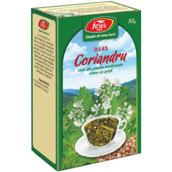 | Compozitia | Fructele plantei Coriandrum sativum L., fam. Apiaceae, conţin ulei volatil în care predomină linaloolul; glicozide flavonoidice, acid cafeic şi clorogenic, tanin, zaharuri, proteine, mucilagii. |